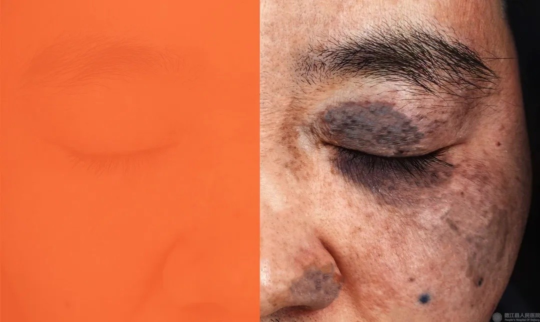 该男士的太田痣左眼上眼睑覆盖着一大片深色的色素沉着,面积较大,几乎占据了整个上眼睑并向眼眶下缘扩展。太田痣是一种常见的真皮色素增加性皮肤病,可出生即有,或青春期因激素影响显现或加重,好发单侧面部三叉神经眼支、上颌支区域,斑片边界不清,不会自愈。